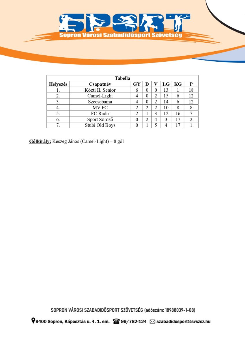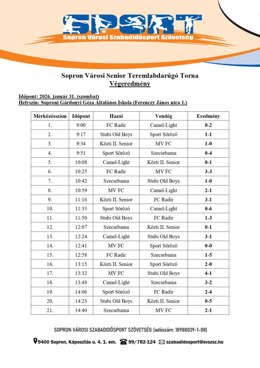 Sopron Városi Senior Teremlabdarúgó Torna 2026 - Végeredmény
